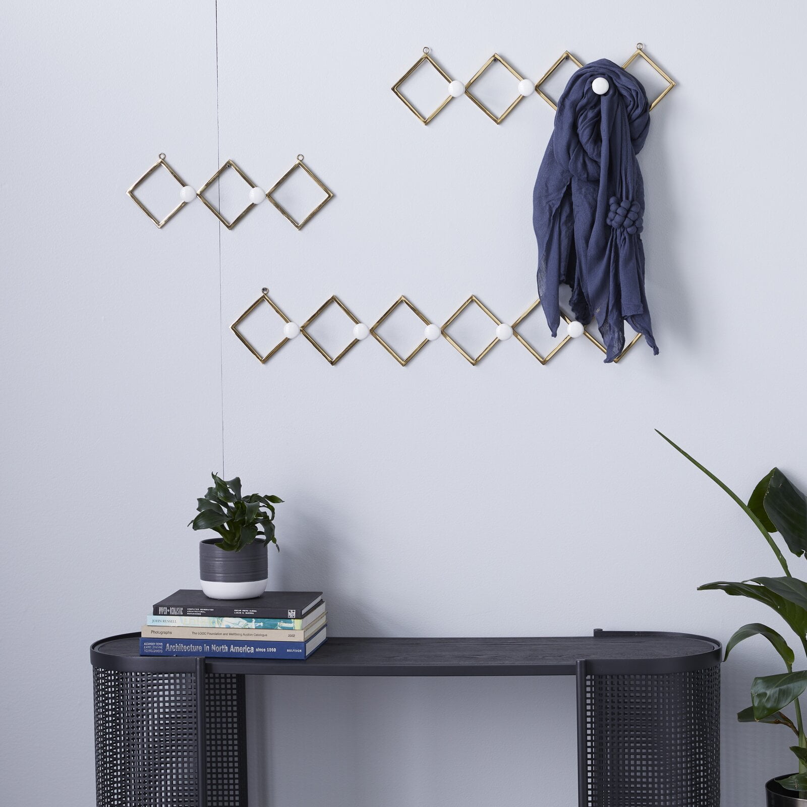 Acres Metal 10 Hook Wall Mounted Coat Rack This Geometric Wall Hook Rack Highlights A Metallic Gold Finish With Pearl White Hook Knobs Glamorous And Elegant This Decor Adds Some Glam